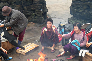 물질 가기 전 불턱에 모여앉아 몸을 녹이며 이야기하고 있는 해녀들 -