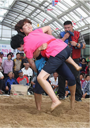 씨름은 주로 강변의 모래사장이나 장터, 마을 공터에서 열린다. 어린이부터 어른까지 공동체의 구성원 누구나 참여할 수 있도록 애기씨름(10대 이하), 총각씨름(10대), 상씨름(20대 이상)으로 구분하여 차례로 진행된다. 씨름의 고수들이 겨루는 상씨름에서 이긴 최종 승자에게는 ‘장사’의 칭호가 부여되며 황소를 부상으로 준다. 경기가 끝나면 장사는 주민들의 축하 속에서 황소를 타고 마을을 돌며 축하 퍼레이드를 벌인다.